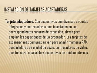 Las tarjetas de expansión son dispositivos que se insertan en las ranuras de la placa base para ampliar las capacidades de una computadora, como agregar memoria, controladoras de video, discos o puertos. Algunos ejemplos mencionados son tarjetas de video, de red, controladoras de discos, capturadoras de video y tarjetas PCMCIA.