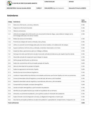 El documento presenta los resultados de la segunda evaluación de una alumna de 4o de primaria en diferentes asignaturas. En cada asignatura se enumeran los estándares evaluados y el valor máximo de cada uno. Las asignaturas evaluadas son: Ciencias de la Naturaleza, Ciencias Sociales, Educación Artística, Educación Física y Lengua Castellana.