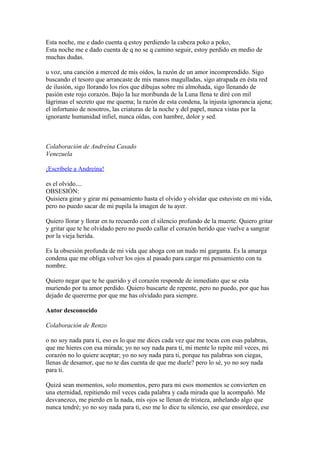 El documento trata sobre la confusión emocional y la pérdida de sentido que siente el autor. Expresa sentirse perdido y sin saber qué camino seguir. También habla sobre el dolor de un amor no correspondido y la búsqueda del tesoro que se le fue arrebatado. Finalmente, expresa la obsesión por olvidar a alguien pero no poder sacar su imagen de la mente.