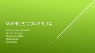 Este documento proporciona una receta para hacer waffles con fruta. Incluye una lista de ingredientes como harina, leche y huevos. Explica los pasos de la preparación como mezclar los ingredientes secos y húmedos y cocinar los waffles. También brinda un dato curioso sobre el origen histórico de los waffles y concluye que es un postre fácil de hacer y popular en todo el mundo.