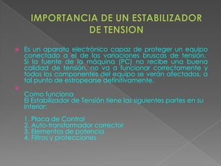 Un estabilizador de tensión es un dispositivo electrónico que protege equipos eléctricos de variaciones en la tensión de entrada, proporcionando una tensión estable de salida de 220 Volts. Funciona mediante un auto-transformador corrector, elementos de potencia y filtros que estabilizan la tensión independientemente de si la entrada es más baja o más alta del valor correcto. Su función principal es proteger equipos de daños que podrían causar variaciones en la tensión eléctrica.