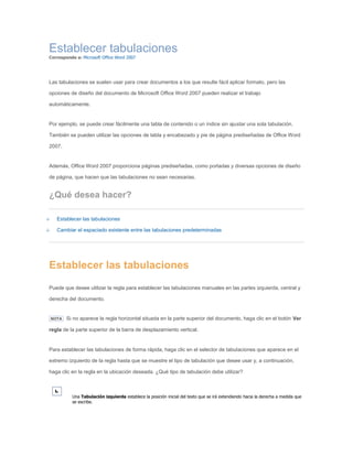 Este documento describe cómo establecer tabulaciones manualmente en Microsoft Word 2007 utilizando la regla de tabulaciones y cómo cambiar el espaciado entre las tabulaciones predeterminadas. Explica que la regla de tabulaciones permite establecer tabulaciones izquierdas, centrales, derechas y decimales haciendo clic en los tipos de tabulación y luego en la regla. También describe cómo acceder al cuadro de diálogo de tabulaciones para establecer posiciones exactas y caracteres de relleno, y cómo cambiar el espaciado entre tabulaciones predetermin