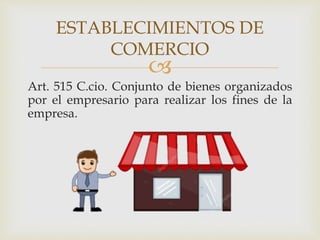 Este documento resume los principales aspectos legales relacionados con los establecimientos de comercio en Colombia. Explica que un establecimiento de comercio incluye elementos como el nombre, inventos, procesos de producción, mobiliario e instalaciones. Además, detalla que los establecimientos deben matricularse en la cámara de comercio dentro del mes siguiente a iniciar operaciones y especifica los pasos para realizar la matrícula. Finalmente, aborda temas como la enajenación forzada, los arrendamientos y la
