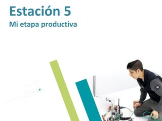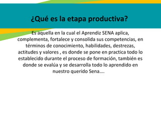 La etapa productiva es cuando el aprendiz SENA aplica, complementa y consolida sus competencias adquiridas en términos de conocimientos, habilidades, destrezas, actitudes y valores a través de un contrato de aprendizaje en el que se vincula laboralmente con una empresa donde puede poner en práctica todo lo aprendido durante su formación en el SENA. El contrato de aprendizaje permite evaluar y desarrollar todo lo aprendido en el SENA y la empresa expide una constancia de cumplimiento satisfactorio.