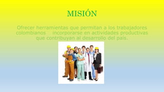 El SENA es una institución colombiana creada en 1957 por Rodolfo Martínez para ofrecer herramientas que permitan a los trabajadores colombianos incorporarse en actividades productivas. Su misión es contribuir al desarrollo del país y su visión es convertirse en una entidad de clase mundial en formación profesional al servicio de personas y empresas. El SENA ofrece contratos de aprendizaje, aseguramiento de calidad en la formación y acceso a bibliotecas y aulas móviles para garantizar el bienestar de los apre