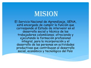 El Servicio Nacional de Aprendizaje (SENA) fue creado en 1957 para ofrecer formación profesional gratuita a los trabajadores colombianos. SENA es una entidad pública que recibe fondos de las empresas para operar en todas las regiones del país, con el objetivo de contribuir al desarrollo social, económico y tecnológico de Colombia a través de la formación profesional.