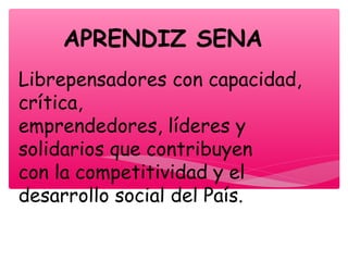 El documento presenta información sobre el aprendiz del SENA, incluyendo su definición, el rol del instructor, los deberes y derechos del aprendiz, y casos relacionados con la aplicación del reglamento del aprendiz. En resumen, el documento establece las pautas y normas que rigen la formación de los aprendices en el SENA.