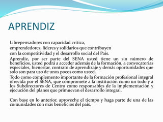 Este documento contiene varias secciones que describen los roles y responsabilidades de aprendices, instructores y personal del SENA. Resalta que los aprendices tienen acceso a beneficios como formación, convocatorias y contratos de aprendizaje. También destaca los deberes de los aprendices como respetar las políticas institucionales, actualizar sus datos y participar en actividades formativas.