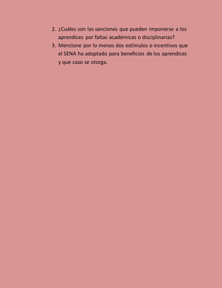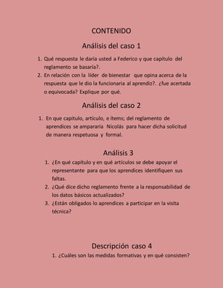 El documento analiza varios casos relacionados con el reglamento de aprendices del SENA. En el primer caso, se indica que el reglamento establece que todo aprendiz tiene derecho a un carnet independientemente de la modalidad de formación. En el segundo caso, se menciona que el instructor debe realizar seguimiento al proceso formativo del aprendiz. Finalmente, se describen las medidas formativas y sanciones que pueden imponerse a los aprendices de acuerdo al reglamento.