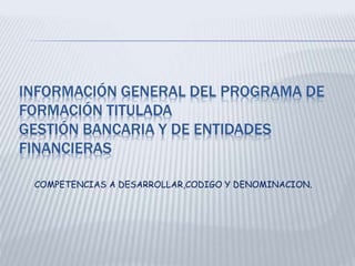 Este documento presenta los códigos, competencias y denominaciones de un programa de formación en gestión bancaria y entidades financieras. Describe 16 competencias agrupadas por códigos que incluyen temas como la administración de cartera, asesoría financiera, análisis de riesgo crediticio, fidelización de clientes, procesamiento de depósitos y pagos, vinculación de clientes, administración de riesgos, coordinación de talento humano, aplicación de tecnologías de la información y competencias blandas.