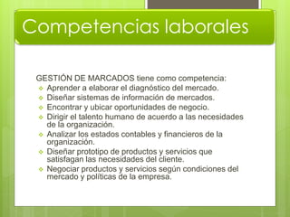Este documento describe el programa de formación en gestión de mercados. El programa busca desarrollar competencias como elaborar diagnósticos de mercado, diseñar sistemas de información de mercados, encontrar oportunidades comerciales, analizar estados financieros, y negociar productos. El objetivo es formar personas con alta capacidad laboral y profesional para que puedan desempeñarse como asistentes de gerencia, ejecutivos de ventas, jefes de servicio al cliente, supervisores de ventas o gestores de su propio negocio.