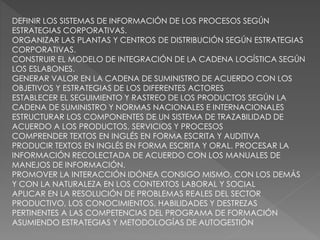 Este documento describe las responsabilidades y habilidades requeridas para un rol de gestión de la cadena de suministro. Incluye proyectar necesidades y requisitos, evaluar procesos, dirigir recursos humanos, formular planes estratégicos de logística, procesar información y monitorear procesos de acuerdo a políticas. También incluye establecer sistemas de distribución, definir sistemas de información, organizar plantas, construir modelos de integración y generar valor en la cadena de suministro.