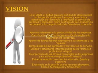 El documento presenta la visión y misión del SENA para el 2020. Su visión es convertirse en una entidad de clase mundial en formación profesional e innovación tecnológica al servicio de personas y empresas. Su misión es ofrecer formación profesional integral para incorporar a las personas en actividades productivas que contribuyan al desarrollo de Colombia. El SENA busca contribuir a la productividad de las empresas, generación de empleo, reducción de pobreza, y vincular la fuerza laboral con las necesidades regionales a través de la cal