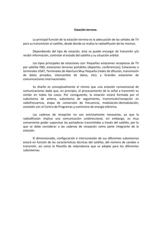 El documento describe 15 diferentes estaciones terrenas y antenas parabólicas ubicadas en la ciudad de Barquisimeto, Venezuela. Las estaciones cumplen funciones como la transmisión y recepción de señales de televisión, radio e internet a través de satélites de comunicaciones. Algunas estaciones son propiedad de empresas privadas de telecomunicaciones, mientras que otras son usadas para transmisiones públicas o con fines educativos.