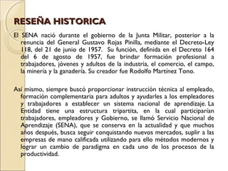 El SENA fue creado en 1957 para brindar formación profesional a trabajadores, jóvenes y adultos en diferentes sectores. Su misión es invertir en el desarrollo técnico de los trabajadores colombianos a través de formación profesional que contribuya al desarrollo del país. El SENA usa sistemas como Sofía Plus y Blackboard Learn para administrar la formación académica de manera flexible y a distancia.