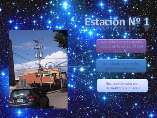 Este documento lista las ubicaciones y coordenadas de varias antenas satelitales y estaciones terrenas en Barquisimeto. Describe sus usos como receptores de canales de televisión, transmisión de señales y datos de compañías como Directv, Promar, V+ TV e Inter.