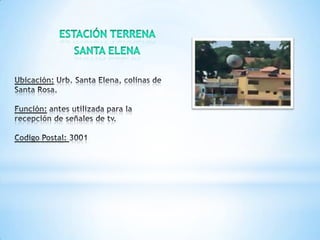 El documento lista varias estaciones terrenas en Venezuela, incluyendo su ubicación, función, código postal y coordenadas. Algunas estaciones terrenas transmiten señales de televisión y radio, mientras que otras se enfocan en comunicaciones de datos y voz.