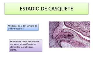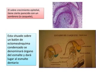 Este documento describe el estadio de casquete en el desarrollo dental temprano, donde se forma un sobrecrecimiento epitelial en forma de casquete sobre una masa de ectomesénquima condensada llamada papila dental. Este casquete epitelial dará lugar al esmalte dental, mientras que la papila dental formará la dentina y la pulpa. El ectomesénquima condensado circundante formará los tejidos de soporte del diente.
