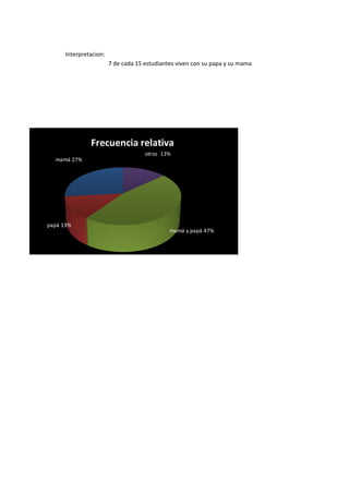 El documento presenta datos sobre la composición familiar de 15 estudiantes, mostrando que el 47% vive con ambos padres, el 27% solo con la madre y el 13% solo con el padre. También se refleja que el 86.67% de los estudiantes no trabajan durante la jornada que reciben clases. Los porcentajes indican una breve interpretación sobre las condiciones familiares y laborales de los estudiantes.