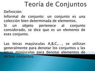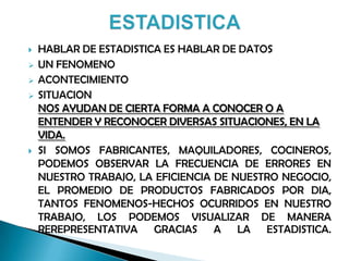 Este documento habla sobre estadística y sus aplicaciones. La estadística se divide en descriptiva e inferencial. La descriptiva organiza y resume datos de forma informativa usando tablas de frecuencia, histograma y polígonos de frecuencia. La inferencial deduce propiedades de poblaciones a partir de muestras. Se describen también conceptos como media, mediana, varianza, desviación estándar y teoría de conjuntos.