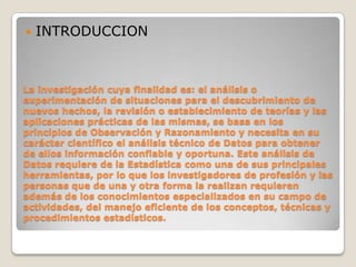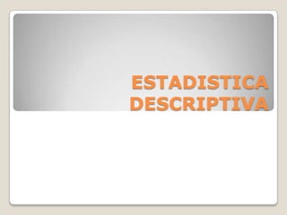 El documento proporciona una introducción a la estadística descriptiva. Explica que la estadística descriptiva provee herramientas para organizar, simplificar y resumir datos básicos a través de tablas, gráficos y medidas. Describe medidas de tendencia central como la media, mediana y moda, y medidas de dispersión como el rango, desviación estándar y varianza. También cubre representaciones gráficas de datos y medidas de posición.