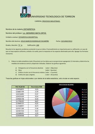 Este documento presenta un problema de estadística descriptiva para un estudiante de procesos industriales en la Universidad Tecnológica de Torreón. El estudiante debe elaborar una tabla estadística con los datos proporcionados agregando 12 intervalos, y determinar medidas de tendencia central y dispersión. También debe elaborar gráficas como un histograma, una ojiva, una gráfica circular con frecuencia relativa, y una gráfica de cajas y bigotes utilizando los datos de la tabla. Se proporcionan enlaces adicional