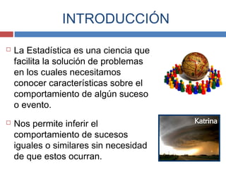 Este documento introduce conceptos básicos de estadística. Explica que la estadística es la ciencia que se encarga de recolectar, organizar, resumir y analizar datos para obtener conclusiones. Se divide en estadística descriptiva y estadística inferencial. También define términos como población, muestra, variable, dato y escalas de medición. Finalmente, describe métodos para ordenar y presentar datos como tablas de frecuencias y gráficos.
