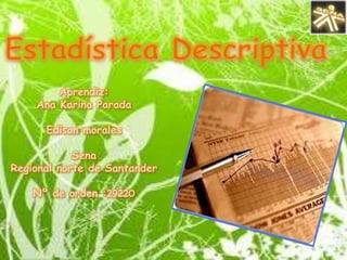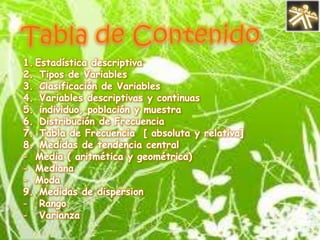 Este documento resume conceptos clave de estadística descriptiva como variables, distribución de frecuencia, medidas de tendencia central, medidas de dispersión y histogramas. Explica que la estadística descriptiva analiza las características de una población o muestra para definir sus propiedades y composición. También define términos como variable cualitativa, variable cuantitativa, mediana, moda, varianza y desviación estándar.