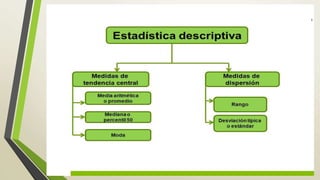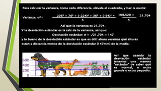 Este documento proporciona una introducción a las medidas estadísticas descriptivas de tendencia central, dispersión y desviación. Explica que la desviación estándar y la varianza miden cuánto se separan los datos de la media, y que la desviación estándar se calcula como la raíz cuadrada de la varianza. Además, proporciona un ejemplo numérico para calcular la media, varianza y desviación estándar de un conjunto de datos de alturas de perros.