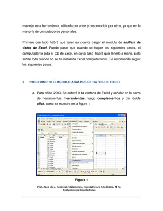 Este documento proporciona instrucciones para realizar análisis estadísticos descriptivos básicos en Excel, incluidos histogramas, tablas de frecuencias y estadísticos. Explica cómo cargar el módulo de análisis de datos en Excel y usar herramientas como estadística descriptiva, histogramas y tablas dinámicas para tabular y resumir datos. También incluye ejemplos con datos reales sobre cómo construir estas tablas y gráficos para variables cualitativas y cuantitativas discret