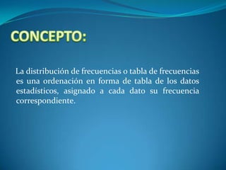 Este documento presenta información sobre tablas de frecuencia y medidas estadísticas. Explica que una tabla de frecuencia ordena y cuenta la frecuencia de datos estadísticos. Luego describe cómo calcular medidas como la media, mediana y moda para datos agrupados y no agrupados, así como medidas de dispersión como rango, desviación media, varianza y desviación típica.