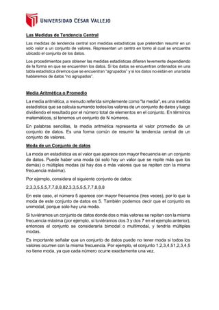 Este documento presenta las tres principales medidas de tendencia central: la media, la moda y la mediana. Define cada medida y proporciona ejemplos para ilustrar cómo se calculan. También explica cómo estas medidas se usan comúnmente en situaciones de la vida diaria y los negocios para resumir y analizar conjuntos de datos.
