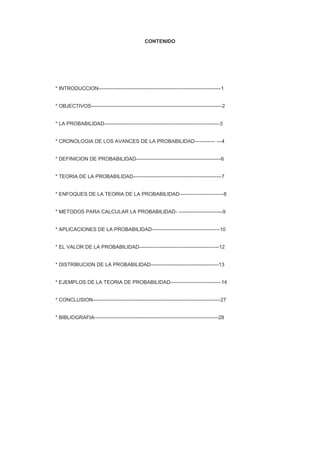 Este documento presenta un resumen de 3 oraciones o menos de la teoría de la probabilidad. Introduce los conceptos básicos de probabilidad y su historia. Explica los diferentes enfoques de la teoría incluyendo el clásico, de frecuencia relativa y subjetivo. Finalmente, proporciona ejemplos para ilustrar los diferentes métodos de cálculo de probabilidad.