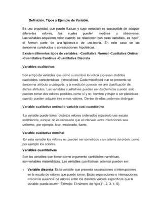 Este documento define y proporciona ejemplos de varios términos básicos en estadística, incluidas variables, población y muestra, escalas de medición, parámetros estadísticos, y términos como razón, proporción, tasa y frecuencia. Explica que una variable puede ser cualitativa o cuantitativa, y que una muestra representativa de una población puede usarse para estudiar características de la población completa. También describe las diferencias entre escalas nominales, ordinales, de intervalo y de raz