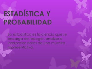 Este documento presenta conceptos básicos de estadística y probabilidad. Explica que la estadística se encarga de recoger, analizar e interpretar datos de una muestra representativa de una población. Detalla los pasos para realizar un proceso estadístico como la recolección y análisis de datos, y la representación gráfica de los resultados. También define términos como población, muestra, variables cualitativas y cuantitativas, y frecuencias absolutas y relativas para describir los datos estadísticos