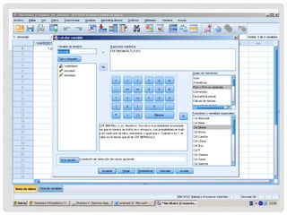 Este documento resume una tarea de seminario sobre la aplicación de modelos estadísticos binomiales, normales y de Poisson en el software SPSS. Se presentan tres casos para cada modelo, calculando probabilidades acumuladas y no acumuladas de diferentes resultados posibles basados en datos de muestras de laboratorio, muertes por cáncer y otros escenarios.