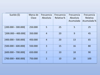 Este documento presenta una introducción a la estadística descriptiva. Explica los orígenes de la estadística y cómo los romanos la utilizaron para realizar censos poblacionales. Luego define conceptos clave como población, muestra, variables cualitativas y cuantitativas. También describe cómo organizar datos en tablas de frecuencias y cómo agruparlos en intervalos para facilitar el análisis. Finalmente, distingue entre estadística descriptiva e inferencial.