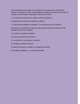 Este documento presenta los resultados de un estudio estadístico sobre los tiempos de atención al cliente en una caja de una tienda de conveniencia. Se analizaron los tiempos de 300 clientes y se calcularon medidas como la media, moda y desviación estándar. Los resultados muestran que el tiempo promedio de atención fue de 3.9 minutos y la mayoría de clientes fueron atendidos en 4 minutos. Sin embargo, algunos clientes tuvieron que esperar más de 4 minutos. Por lo tanto, se concluye que es necesario contratar a un segundo caj