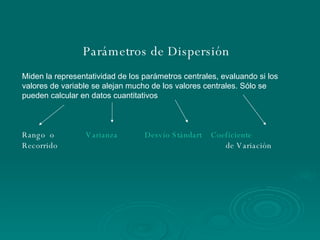 Este documento describe cuatro medidas de dispersión estadística: rango, varianza, desviación estándar y coeficiente de variación. El rango es la diferencia entre el valor máximo y mínimo. La varianza mide el promedio de los cuadrados de las desviaciones de la media. La desviación estándar es la raíz cuadrada de la varianza. El coeficiente de variación es la desviación estándar dividida por la media.