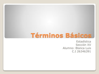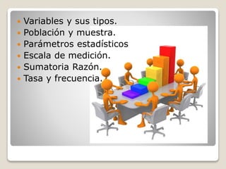 Este documento define y explica varios términos básicos de estadística como variables, población y muestra, parámetros estadísticos y escalas de medición. Describe los diferentes tipos de variables según su nivel de medida y de influencia, así como los distintos parámetros estadísticos de centralización, dispersión y posición. Finalmente, explica las diferentes escalas de medición como nominal, ordinal, de razón, de intervalo y de proporción.
