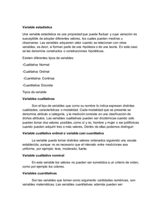 Una variableestadística es una propiedad que puede fluctuar y cuya variación es