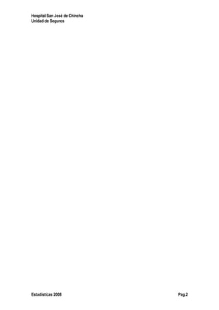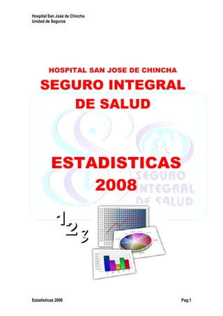Este documento resume las estadísticas del Seguro Integral de Salud (SIS) en el Hospital San José de Chincha para el año 2008. Reporta un incremento del 31.5% en la población asegurada respecto al año anterior, alcanzando un total de 2,938 asegurados. También muestra un aumento del 37.2% en las atenciones, con un total de 17,411 atenciones. El valor de producción tarifado para el año 2008 fue de S/. 581,049, representando un incremento del 37.19% con respecto al año