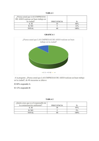 El resumen analiza los resultados de una encuesta realizada a 40 personas sobre temas ambientales. 88% de los encuestados opinó que las empresas de aseo realizan un buen trabajo en la ciudad. 95% consideró que los seres humanos son los principales responsables de la contaminación ambiental. Casi todos, el 98%, conocían el significado de desechos sólidos. La mayoría, el 60%, consideró que el enfoque CTS (ciencia, tecnología y sociedad) es importante para entender problemas ambientales. Todos los encuestados, el 100%, creyeron que la contamin