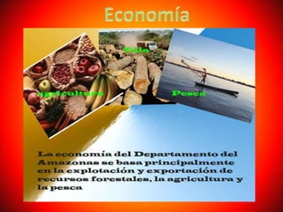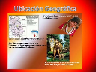El documento describe el Estado Amazonas en Brasil. Menciona que el árbol emblemático es el caucho Hevea, la flor emblemática es la Victoria Amazónica y el animal emblemático es el delfín rosado. También describe las principales maderas y cultivos de la región, incluido el arroz, maíz y yuca. Finalmente, brinda detalles sobre la vestimenta tradicional de la región, particularmente de las mujeres y los hombres.