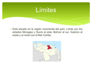 El estado Anzoátegui se encuentra en el noreste de Venezuela. Limita con los estados de Monagas, Sucre, Bolívar y Guárico, así como con el Mar Caribe. La economía depende principalmente de la industria petrolera. Algunos símbolos notables incluyen la bandera con franjas azul, amarilla y verde, y el escudo que representa la independencia y la riqueza agrícola. El turismo se centra en playas, termas, ríos y parques nacionales como Mochima. La cocina tradicional incl