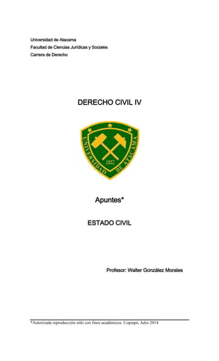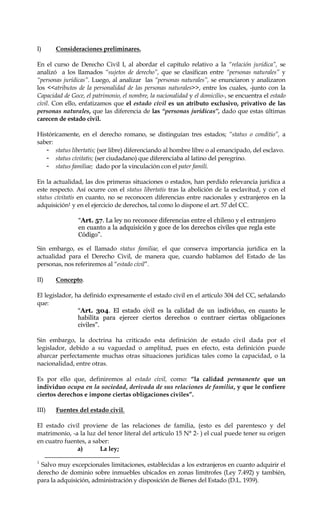 Este documento presenta un resumen del concepto de estado civil según el derecho civil chileno. Explica que el estado civil es un atributo exclusivo de las personas naturales que deriva de sus relaciones familiares y les confiere derechos y obligaciones. Define el estado civil y analiza sus características, fuentes y formas de prueba. También discute la historia del concepto y las distintas definiciones legales del estado civil en Chile.
