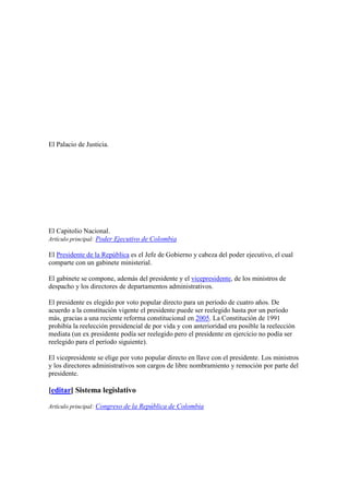 Colombia es una república unitaria con separación de poderes ejecutivo, legislativo y judicial. El poder ejecutivo recae en el Presidente, actualmente Juan Manuel Santos, quien es elegido por voto popular cada 4 años. El poder legislativo corresponde a un Congreso bicameral. El poder judicial está conformado por varias cortes como la Corte Suprema de Justicia.
