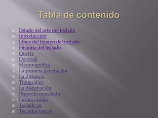 Este documento presenta una línea de tiempo y resumen histórico de los principales tipos de teclados, incluyendo el teclado QWERTY original de 1873, el teclado Dvorak diseñado en 1936 para mejorar la eficiencia, y los teclados modernos integrados en computadoras personales desde 1980. Explica que el teclado QWERTY se diseñó originalmente para prevenir atascos mecánicos, mientras que Dvorak mejoró la distribución de las teclas basado en la frecuencia de letras y ergonomía. Aunque