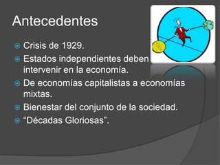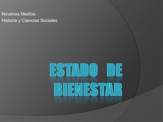 El documento describe la historia y características del Estado de bienestar desde su surgimiento luego de la Gran Depresión de 1929. Explica que los estados independientes comenzaron a intervenir más en la economía para proteger el bienestar social después de la crisis. Luego de la Segunda Guerra Mundial, los países desarrollados expandieron los servicios sociales como salud, educación y subsidios. Mientras que en América Latina se implementaron reformas para industrializarse y mejorar la productividad agrícola a través de la CEPAL, aunque hubo problemas de