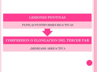 El documento define el estado de coma como una severa pérdida de conciencia que puede ser causada por intoxicaciones, anomalías metabólicas, enfermedades del sistema nervioso central, accidentes cerebrovasculares, traumatismos craneoencefálicos o convulsiones. Describe los patrones respiratorios como el de Cheyne-Stokes y la hiperventilación neurogénica central como signos que pueden indicar lesiones estructurales o trastornos metabólicos. Finalmente, señala que las pupilas fijas e inre